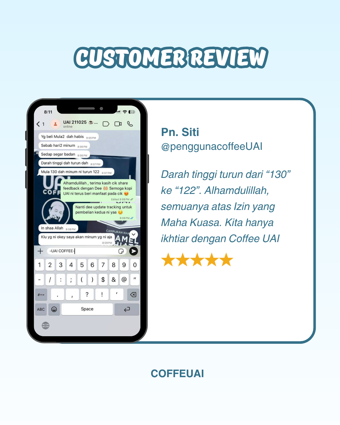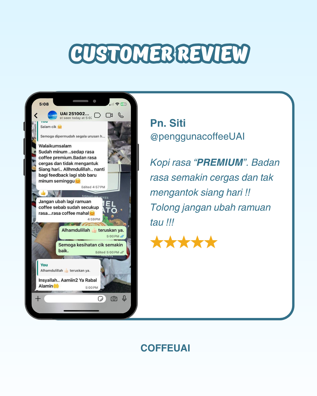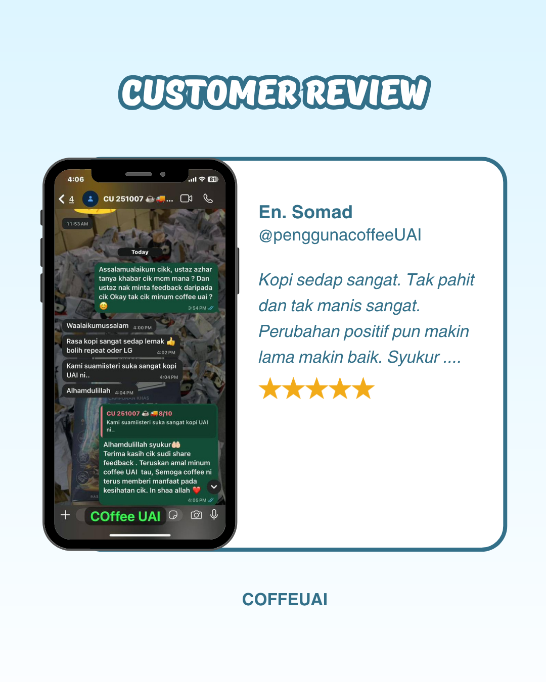 Syukur Alhamdulillah! Ini ialah feedback jujur daripada pelanggan UAI Coffee sendiri hasil daripada usaha kami yang sentiasa melakukan follow-up dan memberi panduan berterusan!
