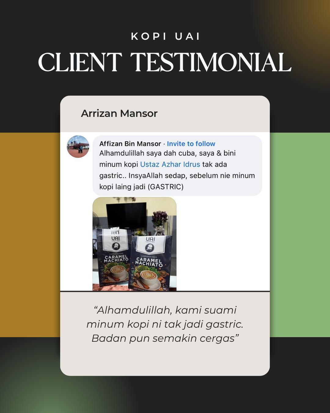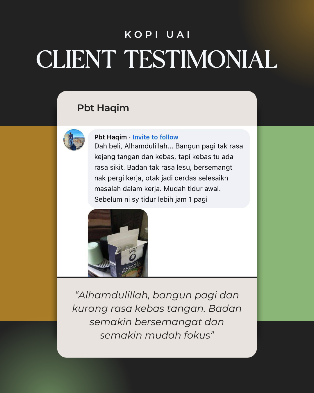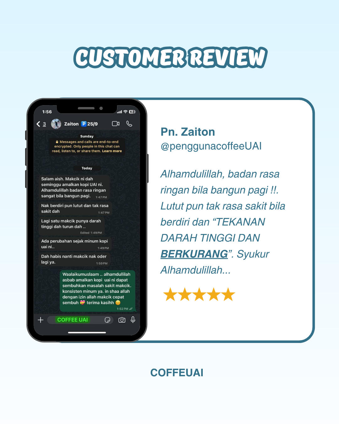 Syukur Alhamdulillah! Ini ialah feedback jujur daripada pelanggan UAI Coffee sendiri hasil daripada usaha kami yang sentiasa melakukan follow-up dan memberi panduan berterusan!