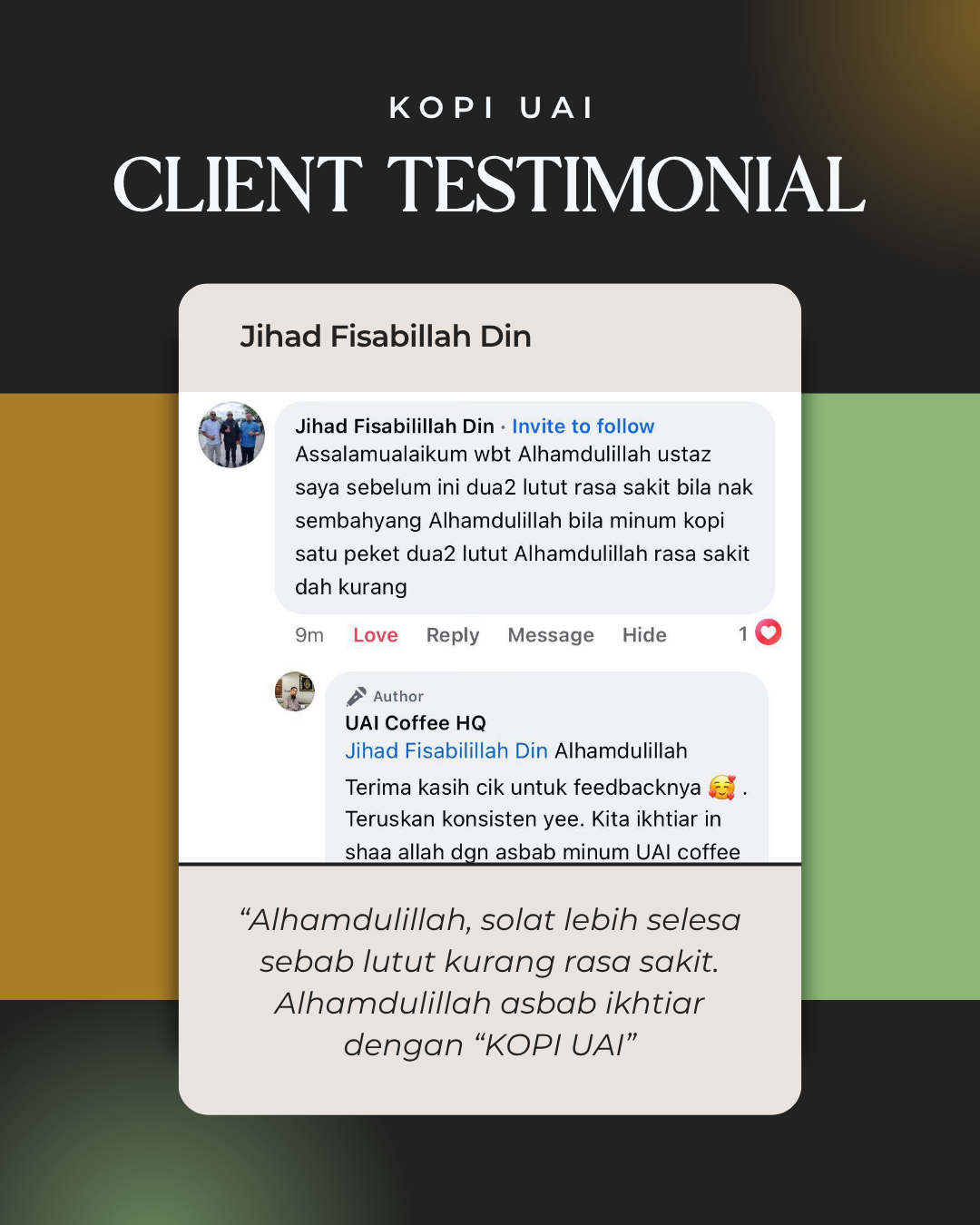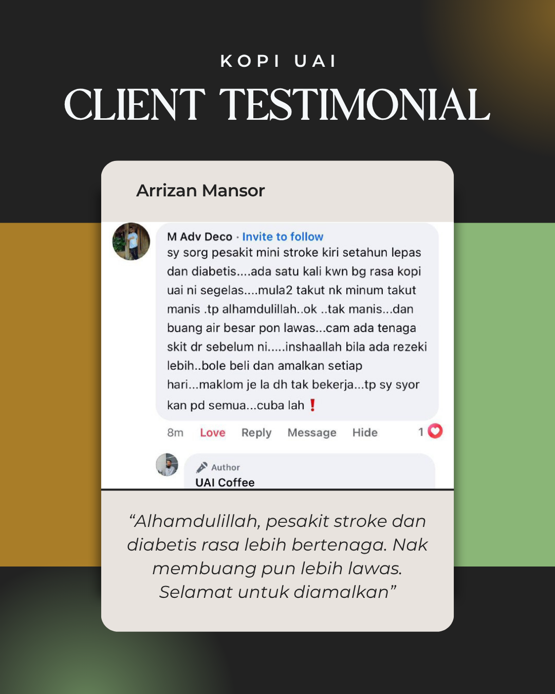 Alhamdulillah, ramai yang berpuas hati dengan manfaat UAI Coffee sebagai usaha untuk mencegah dan meningkatkan tahap kesihatan.