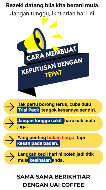 Itulah sebabnya kami sediakan Trial Pack RM49.90 (10 sachet) dahulu. Tak perlu beli banyak-banyak — cuba dulu dan nilai sendiri. Kalau sesuai dengan anda, baru teruskan pembelian.Kami mahu pelanggan rasa yakin, bukannya menyesal.
