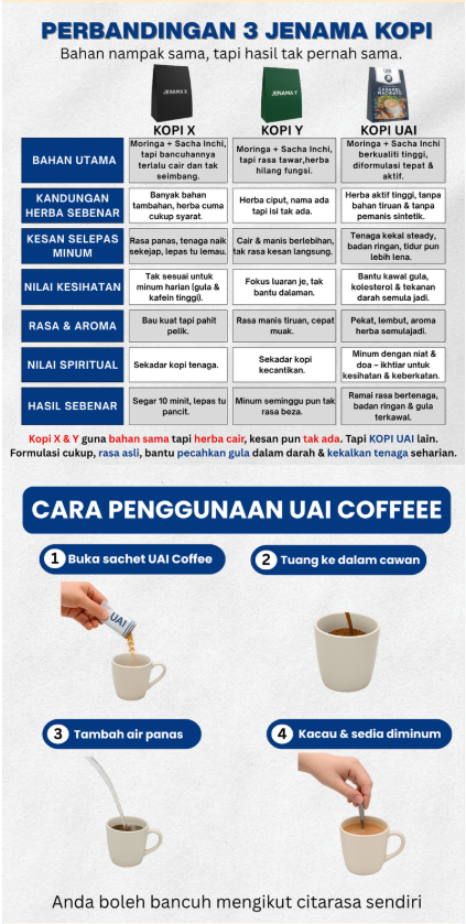 Kami mengerti perasaan anda. Jadi, kami tak buat janji luar biasa — tapi yakin, bila anda mula hari ini, ia beri peluang untuk alami perubahan sendiri. UAI Coffee dirumus dengan bahan semula jadi seperti Moringa, Sacha Inchi, dan White Tiger Mushroom, yang membantu menstabilkan tenaga, paras gula, dan sistem saraf secara semula jadi.